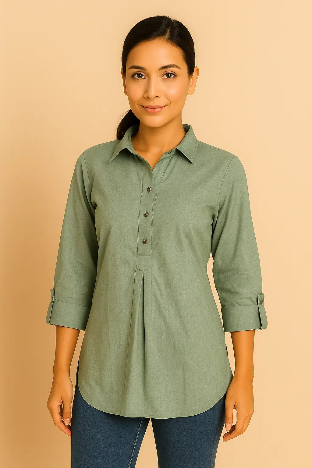 The soft grey hue adds a touch of minimalistic charm, making it ideal for both workwear and casual outings. Featuring a smart collar, relaxed fit, and detailed tailoring, this tunic flatters all body types and pairs effortlessly with jeans, trousers, or even ethnic bottoms.